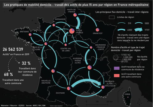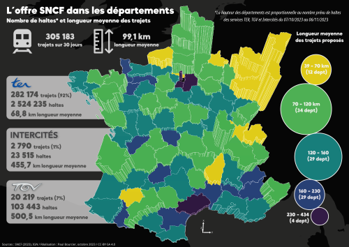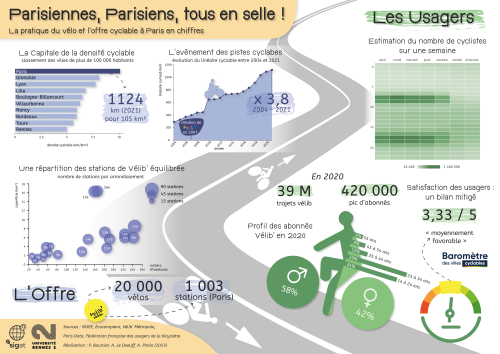 An infographic presenting data on cycling practices (number of cyclists, profile...) and supply (equipment, development policies...) in Paris. Made with : LibreOffice Calc - Flourish - Adobe Illustrator